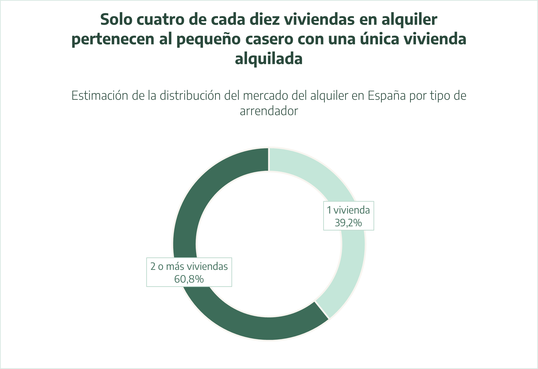 Madrid, 23 de abril de 2026.- Menos de cuatro de cada diez viviendas en alquiler habitual pertenecen a pequeños caseros que tienen una única vivienda alquilada, si tenemos en cuenta el mercado del alquiler más allá de los arrendadores particulares, incluyendo el peso que tienen en dicho mercado las personas jurídicas -empresas, fondos y entidades públicas-. Alrededor del 39% de las viviendas alquiladas pertenecen a caseros particulares con un único inmueble en alquiler. Aproximadamente, el 61 % restante estaría en manos de particulares con dos o más viviendas en alquiler, personas jurídicas y entidades públicas.