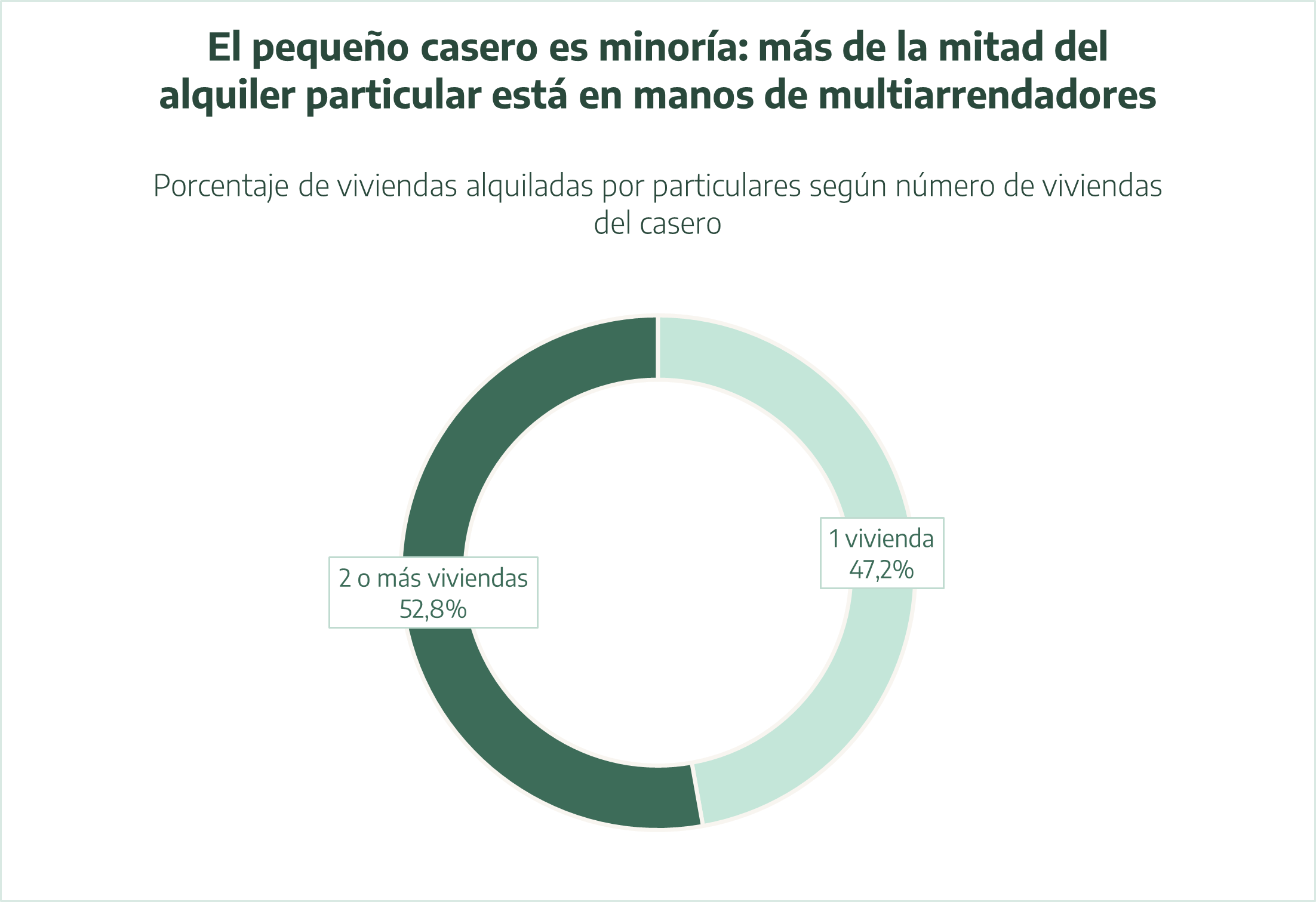 El informe demuestra que más de la mitad del alquiler gestionado por particulares en España está en manos de multiarrendadores, personas que alquilan dos o más viviendas a otras personas. En concreto, la cifra asciende al 52,8%, por lo que la figura del pequeño casero no es la predominante en nuestro país: más de la mitad del mercado de particulares está controlado por caseros que tienen dos o más viviendas en alquiler.