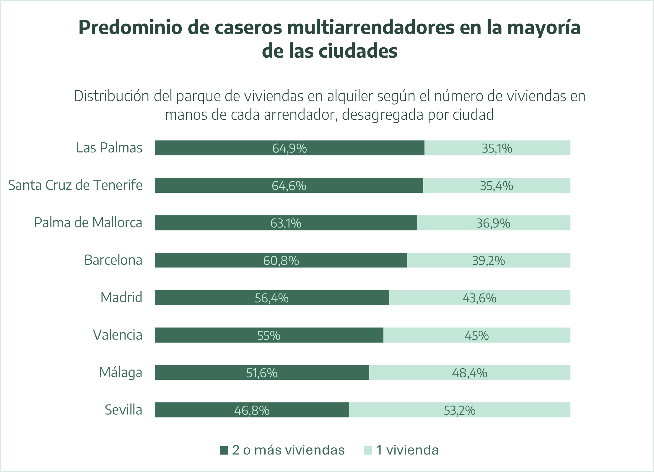Las Palmas de Gran Canaria es la capital que presenta la mayor concentración: el 64,9% de los caseros son multiarrendadores, frente al 35,1% que dispone de un único inmueble en alquiler. Le sigue muy de cerca Santa Cruz de Tenerife, con un 64,6% frente a un 35,4%.