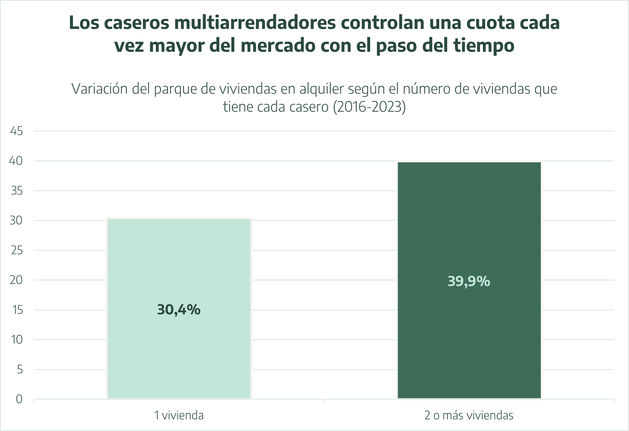 Entre 2016 y 2023 el parque de viviendas alquiladas por particulares pasó de 1.900.883 a 2.570.845 viviendas. Este aumento no estuvo impulsado principalmente por pequeños caseros con una sola vivienda, sino por multiarrendadores con carteras más amplias.