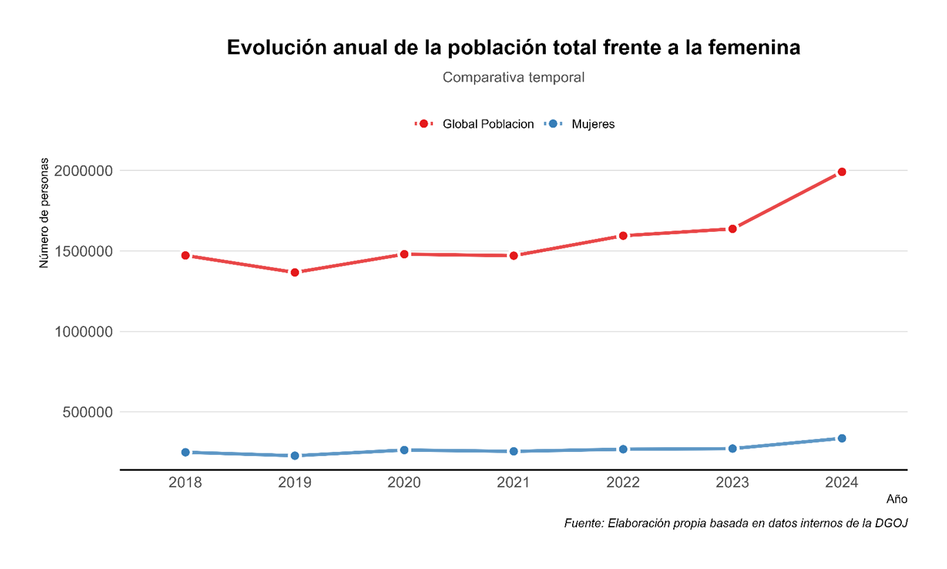 A pesar de ello, el juego online sigue siendo un sector ocupado de forma mayoritaria por hombres. Las mujeres que juegan de forma activa apenas representan un 16,9% y se calcula que, en total, hay 335.627 jugadoras de entre las casi 2 millones de personas (1.991.550) que hacen apuestas online.