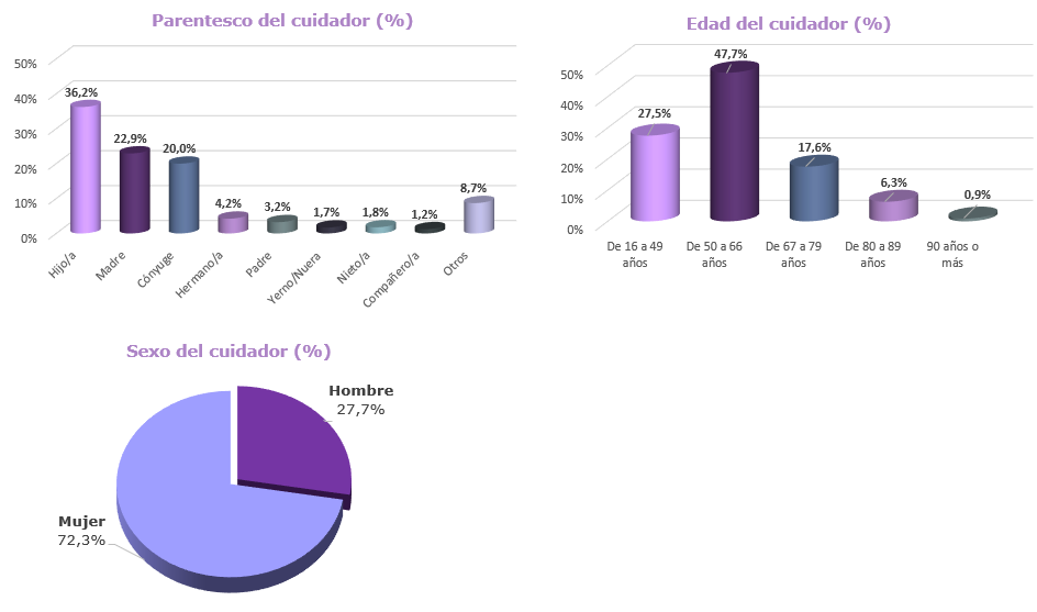 Estos datos confirman la dimensión de género en la longevidad y en el acceso a los cuidados, y ponen de manifiesto que la dependencia tiene un marcado rostro femenino, ya que además, las personas cuidadoras no profesionales son principalmente mujeres (72,3%), de las cuales más del 72% tienen más de 50 años, que cuidan principalmente a sus madres y padres. En términos estadísticos, el SAAD considera persona cuidadora no profesional a aquella vinculada a una prestación económica de cuidado en el entorno familiar.